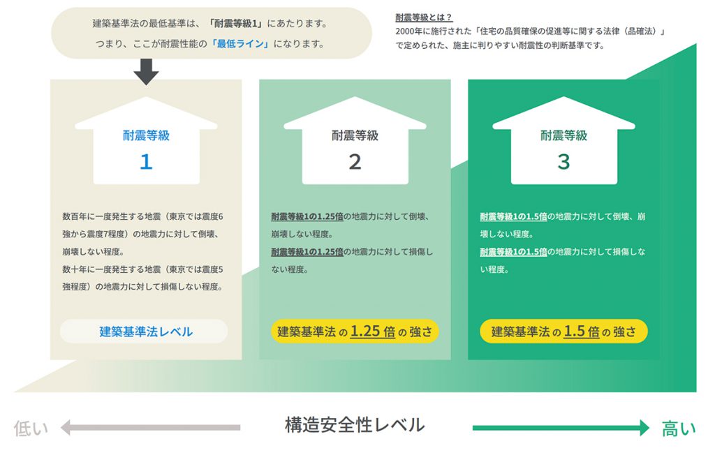 建築基準法を守るだけでは、建物は倒壊し、家族の命も危険にさらされます。地震に強い住宅を目指すなら、通常の建築基準よりも強固で頑丈な耐震等級3以上が望ましいです。