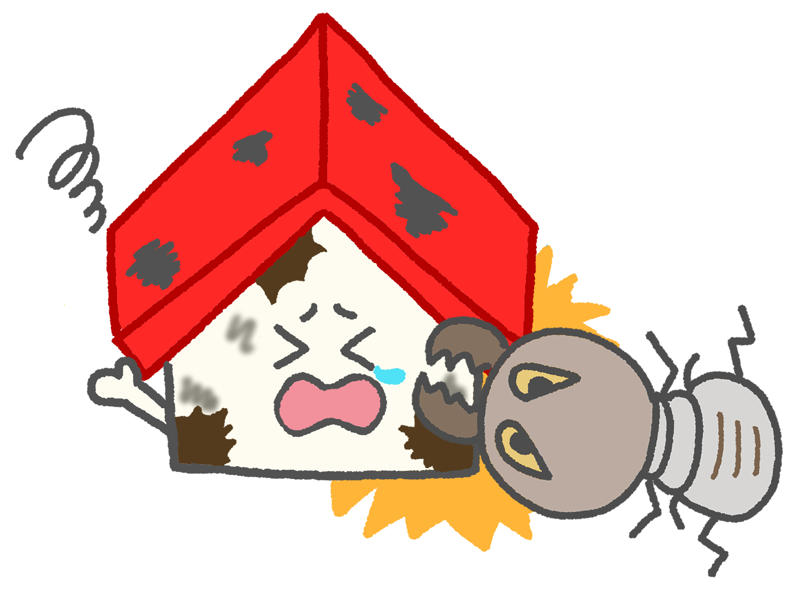 →シロアリの被害のイメージとして、家を支える柱が食われ、家が倒れてしまう!?というのがありませんか?実際にはシロアリだけで家が倒れることはないのですが、家を支える柱がやられると耐震性の問題点が出てきます。
