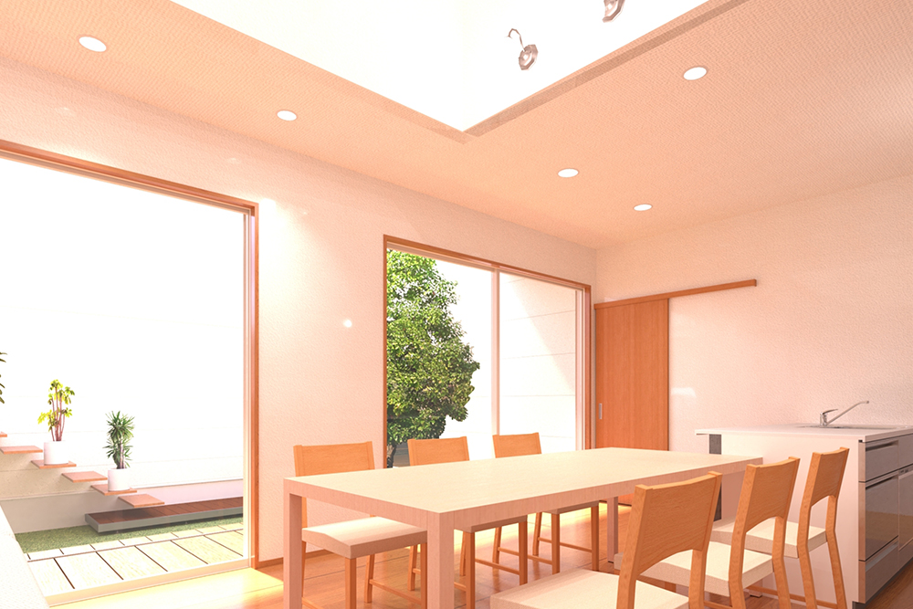 - LDKに掃き出し窓を採用し、中庭の広々としたウッドデッキへ繋げる。天気の良い日には家族でランチを!