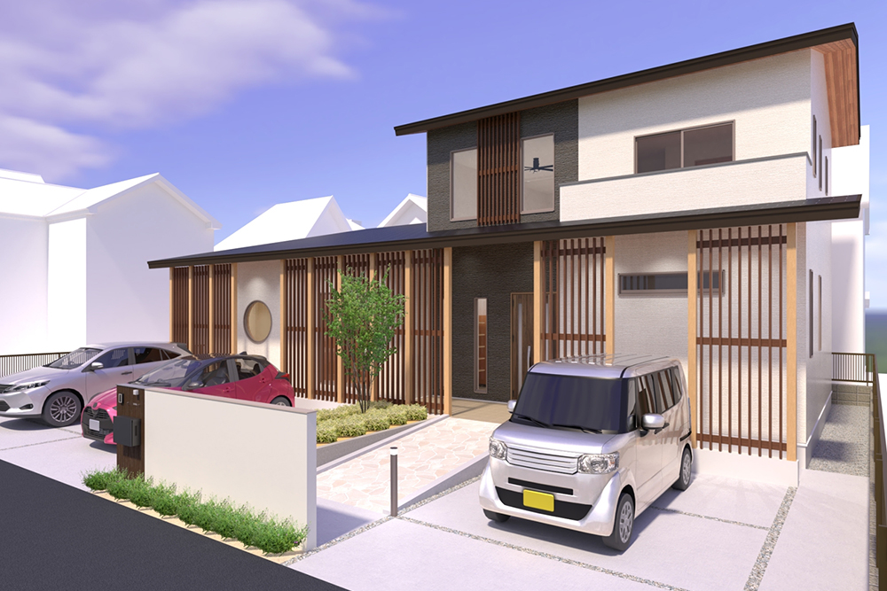 - 木目調のルーバーを主役に、軒天も木目調に揃えて「和」を感じるデザインに