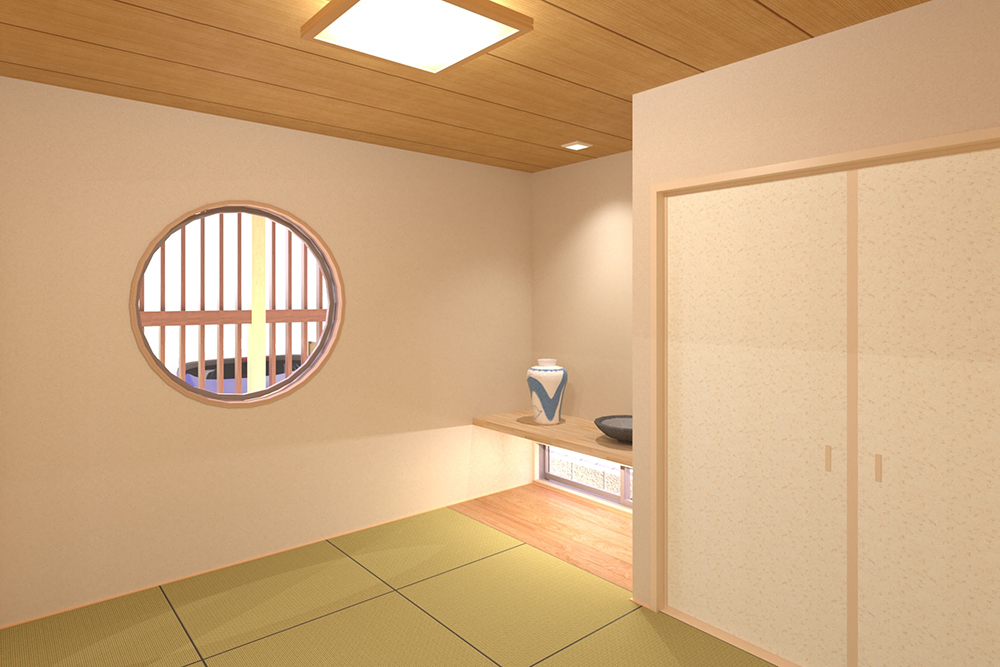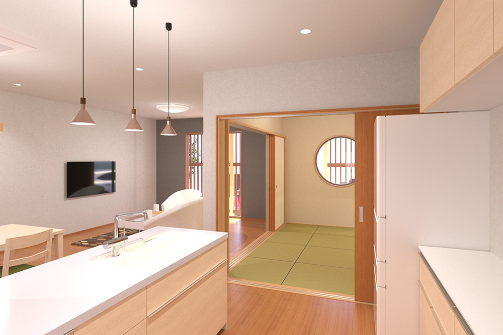 『キッチンから見える、リビングと繋がった丸窓の和室』に一工夫
